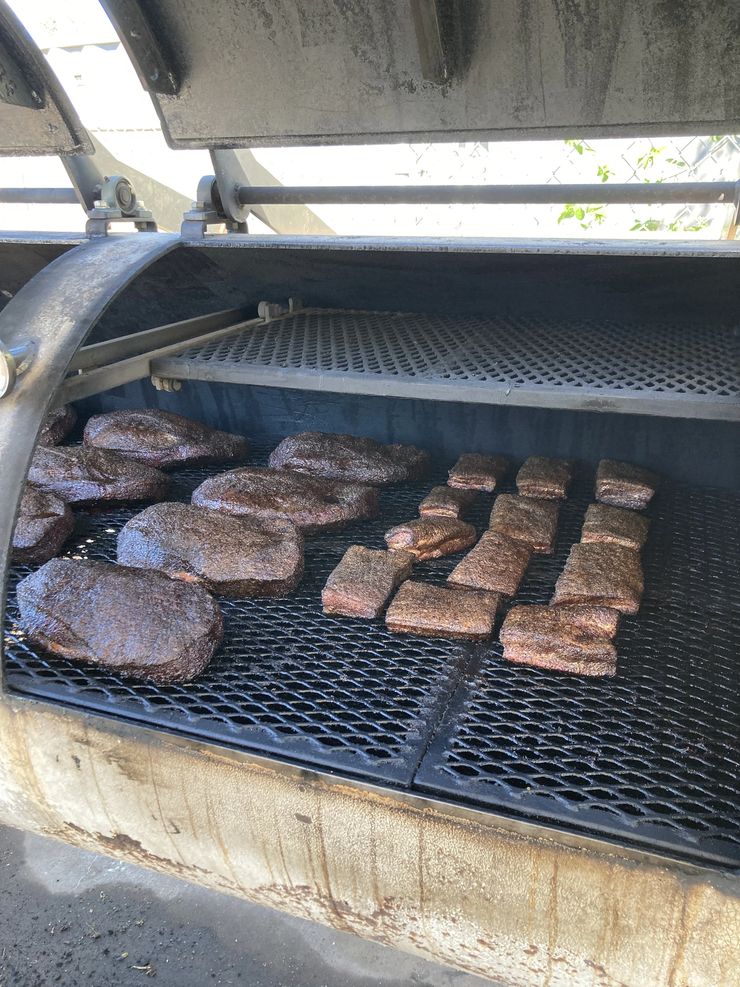 Autre midi avec une découverte de l'authentique BBQ (prononcez barbecue) texan, considéré comme l'une des rares et vraies cuisines originaires d'Amérique (le reste étant pompé à droite à gauche). Imaginez un énorme tonneau de métal recyclé dans lequel on installe un sytème de feu à bois où la fumée dégagée par une variété très spéciale et locale de bois vient cuire pendant plus d'une journée les morceaux de bidoche les moins recherchés de la bêtes. Le BBQ raconte un peu l'histoire de ces contrées, c'est une méthode pour attendrir la viande en la cuisant très lentement et très longuement, les morceaux les plus onéreux étant à l'époque directement vendus et expédiés aux steak houses du nord des Etats-Unis. Résultat ? Je dois avouer que c'est succulent. Ça fond sur la langue, c'est parfumé via des recettes, marinades et épices véritablement secrètes, et pour le peu que vous ayez quelques garnitures à fourrer dans le pain, ça devient un burger ultra luxe.